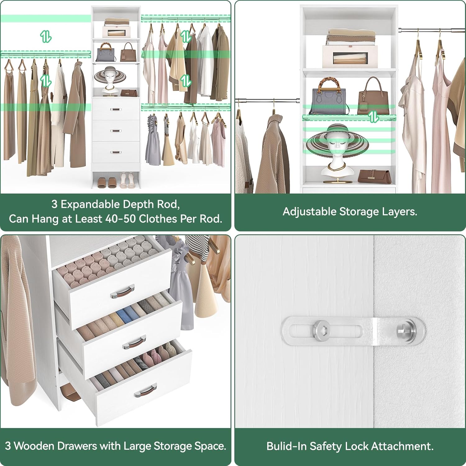• About Organization and Capacity - This 8ft closet has 3 adjustable hanging rods, so you can hang the cloth on the hanging rods and you can also put clothes on the shelves too. It is a 500+ LBS and 150pcs clothes capacity closet organizer system.