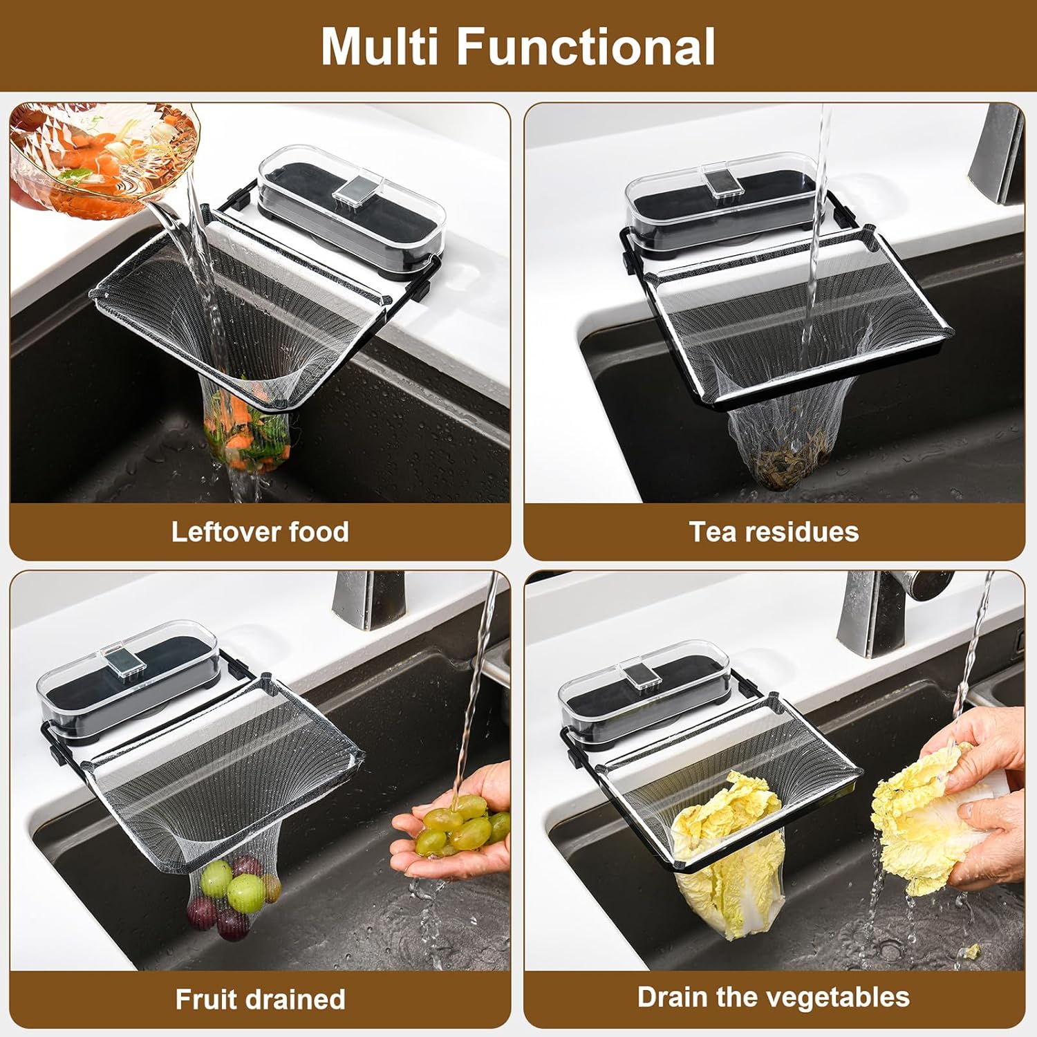 • 4.Includes 50 Kitchen Sink Food Strainer Mesh Bags + Easy Replacement: Comes with 50 high-quality polyester fiber mesh bags to effectively catch food scraps, peels, tea leaves, seasonings, and fabrics, preventing sink clogs. Effortlessly attaches to the frame corners for quick swaps.