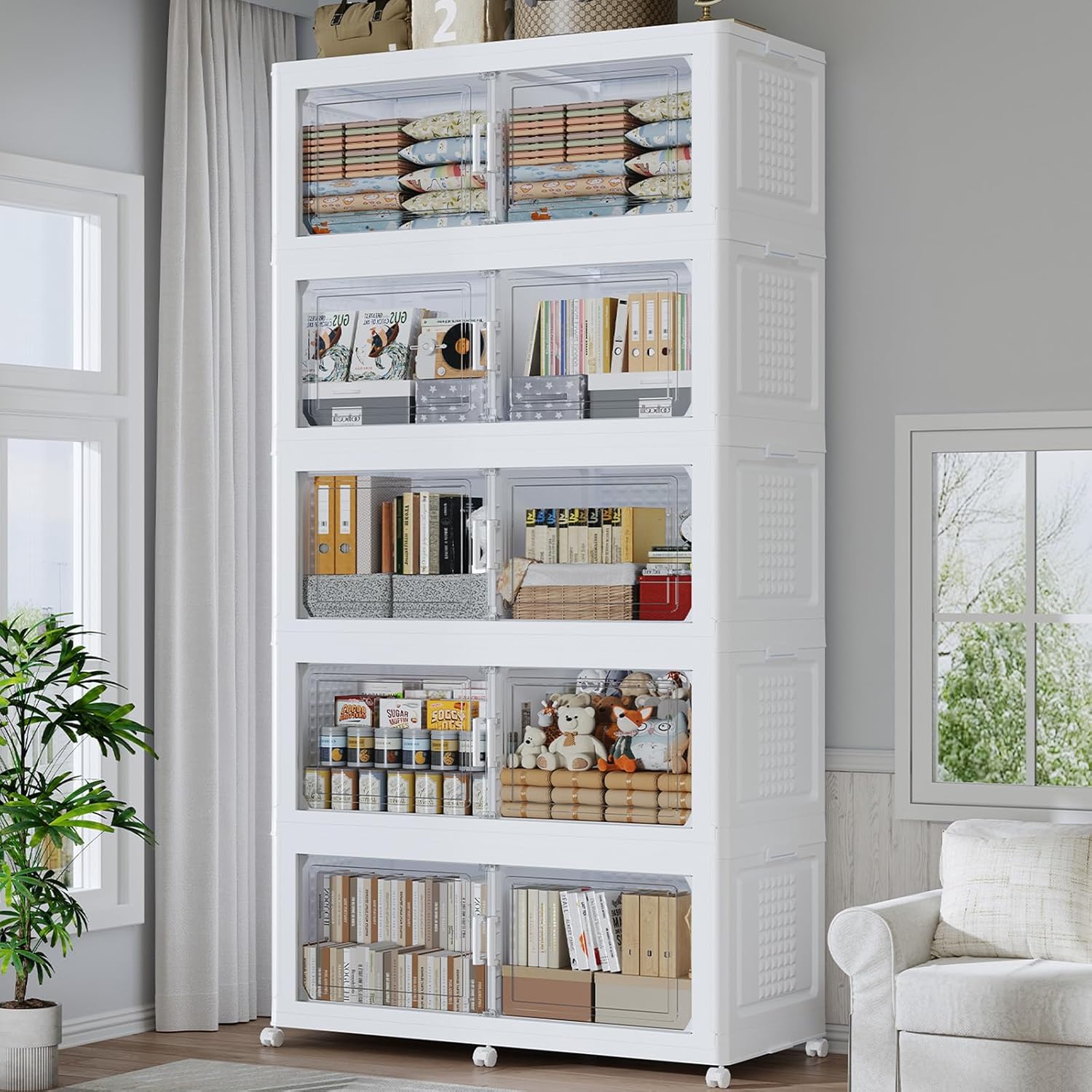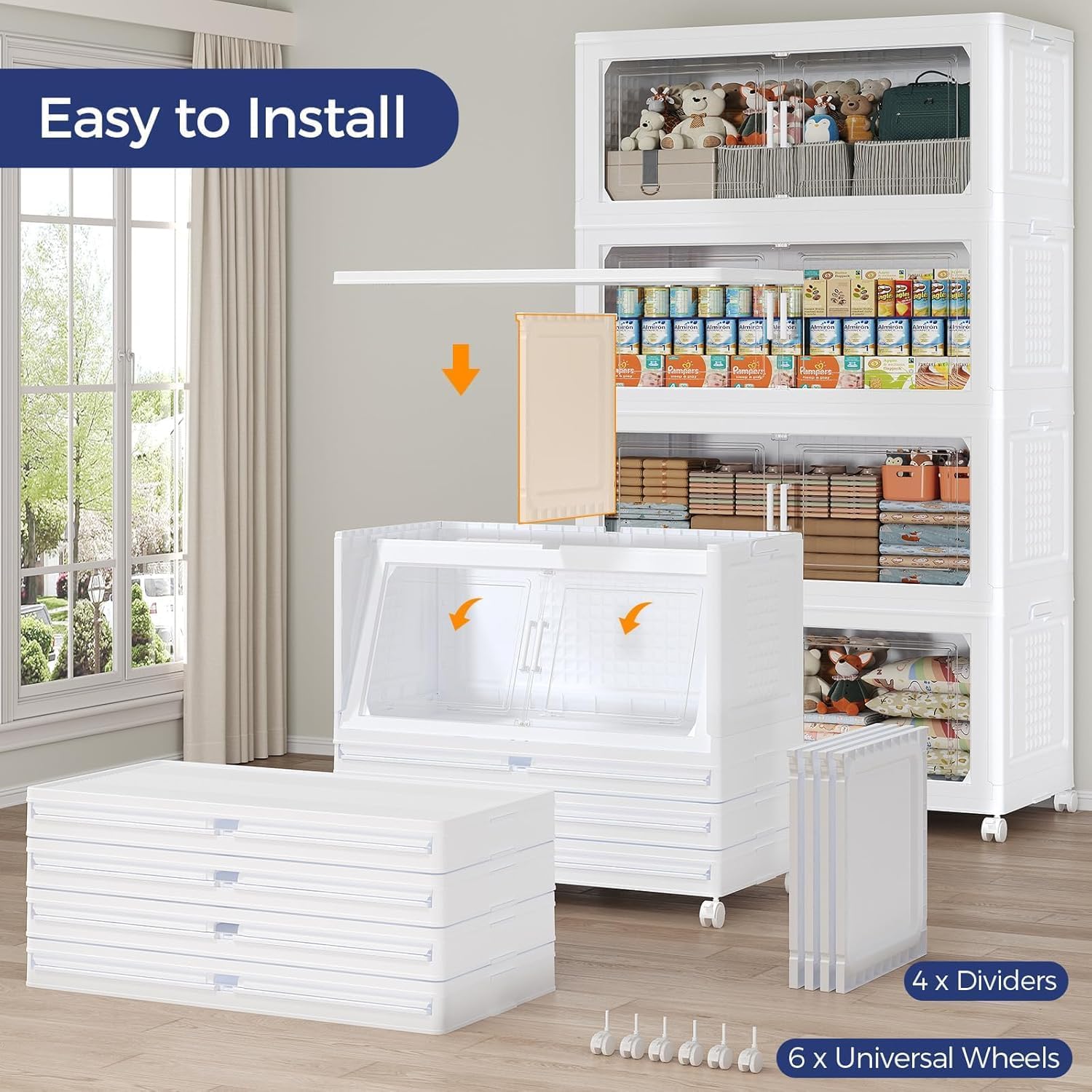 - 【Two Ways to Open & Clear Magnetic Door】The collapsible storage bins with lids and wheels feature a dual access way, allowing for both top and front door openings, and with clear windows for easy visibility. The stackable plastic storage bins with open front doors are equipped with magnetic lock buckles to prevent dust from entering the cabinet.