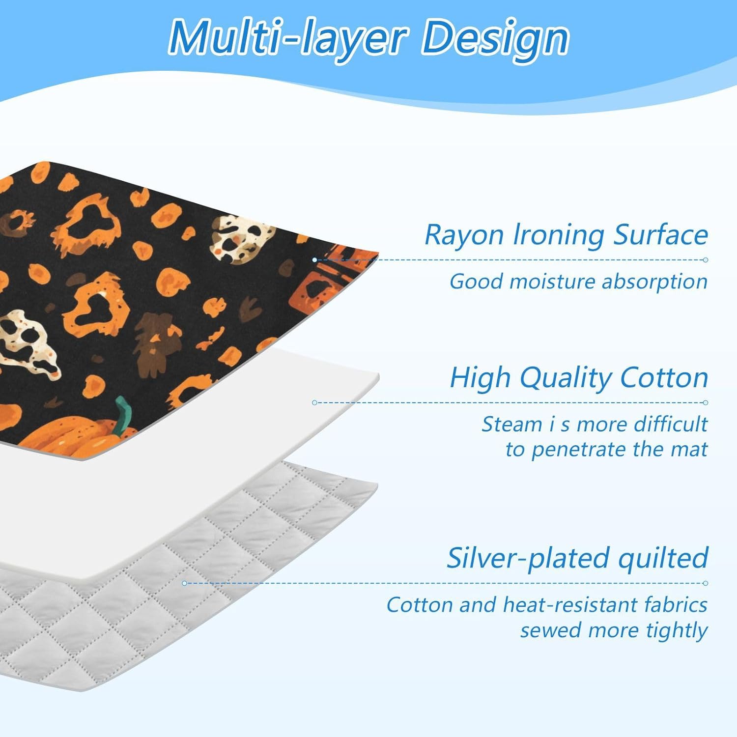 • Material: The ironing mat for table top has 3 layers, rayon ironing surface + high quality cotton + silver-plated quilted fabric, making it durable to use