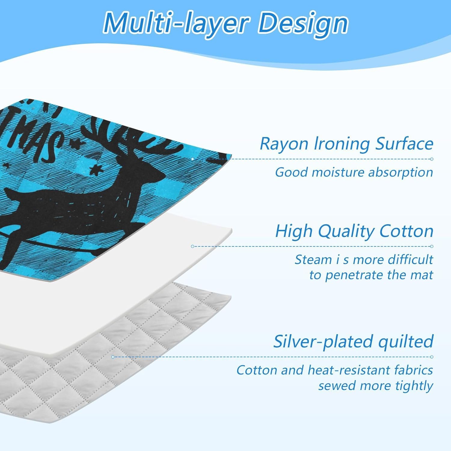 • Material: The ironing mat for table top has 3 layers, rayon ironing surface + high quality cotton + silver-plated quilted fabric, making it durable to use