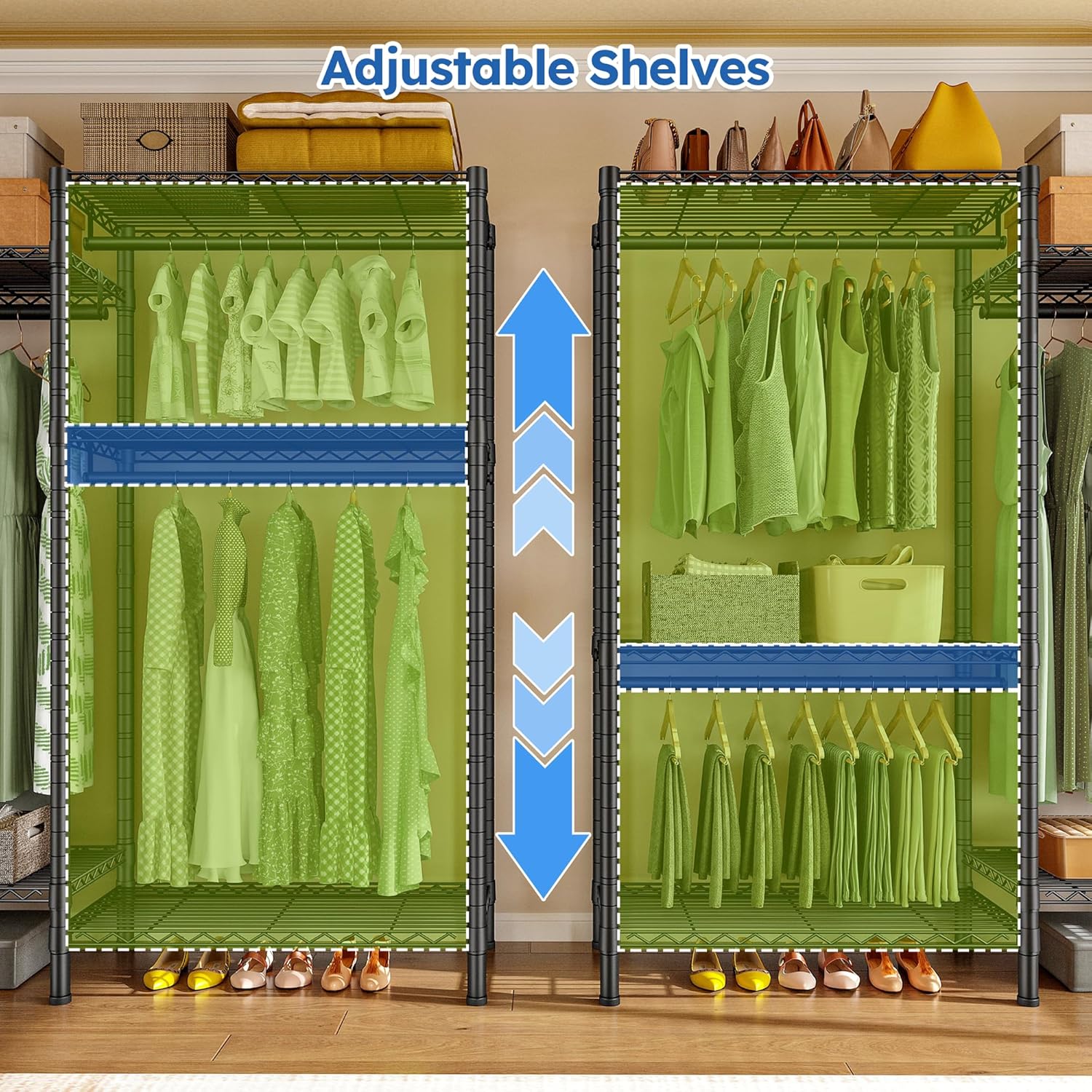 • 【Industrial-Grade Load Capacity】Metal clothes racks high-grade metal frame supports 8 adjustable shelves (110 lbs/tier) and 5 rods (80 lbs/rod). Adjustable feet ensure stability, protect floors from scratches, and make clothing rack with shelves suitable for daily heavy storage or commercial display settings.