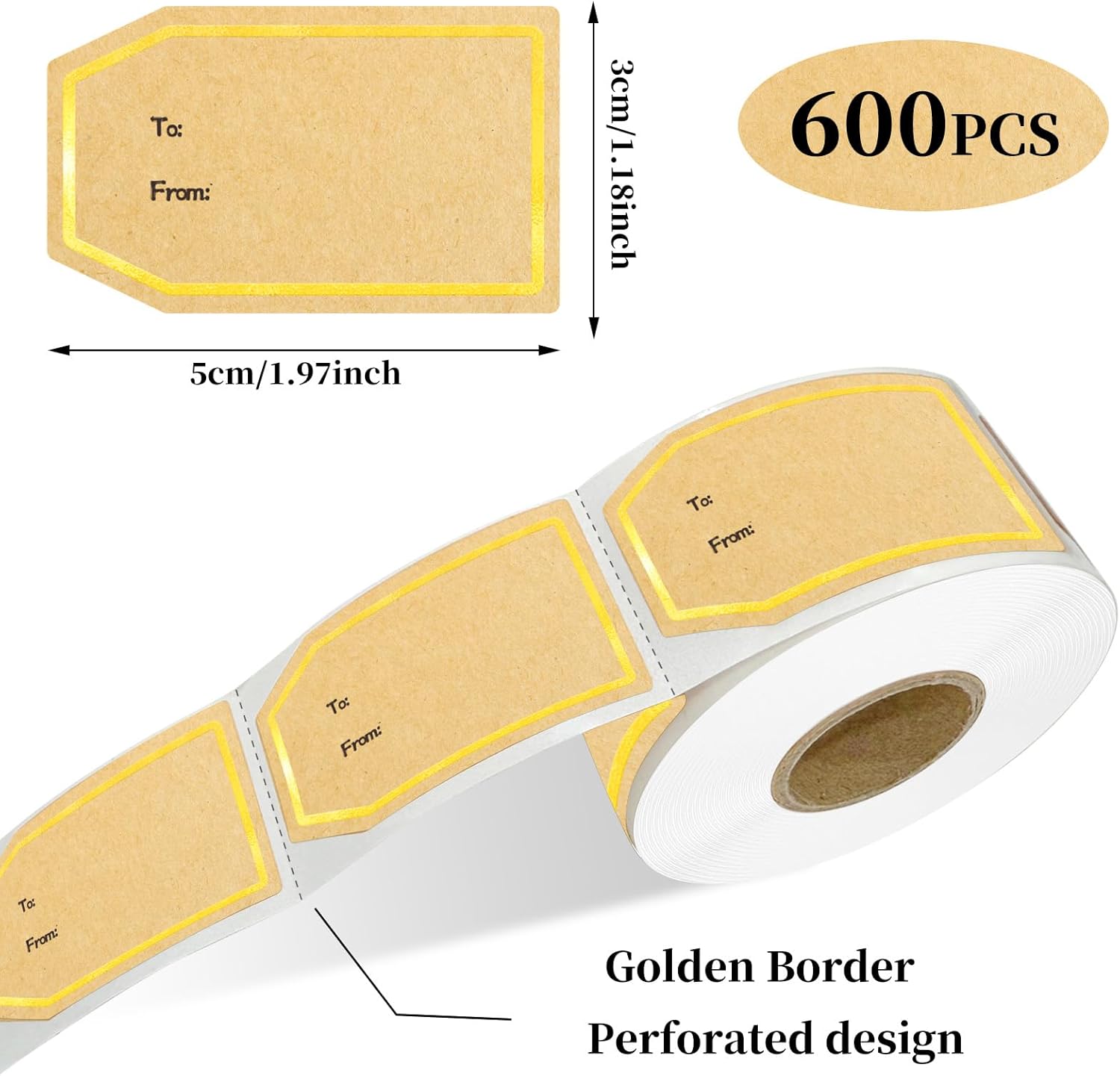 600PCS Gift Tag Stickers, 1.18" x 2" Gold Border Christmas Gift Tags Stickers, Brown Kraft to and from Gifts Labels Self Adhesive Christmas Labels Holiday Present Label, Perforated line Design