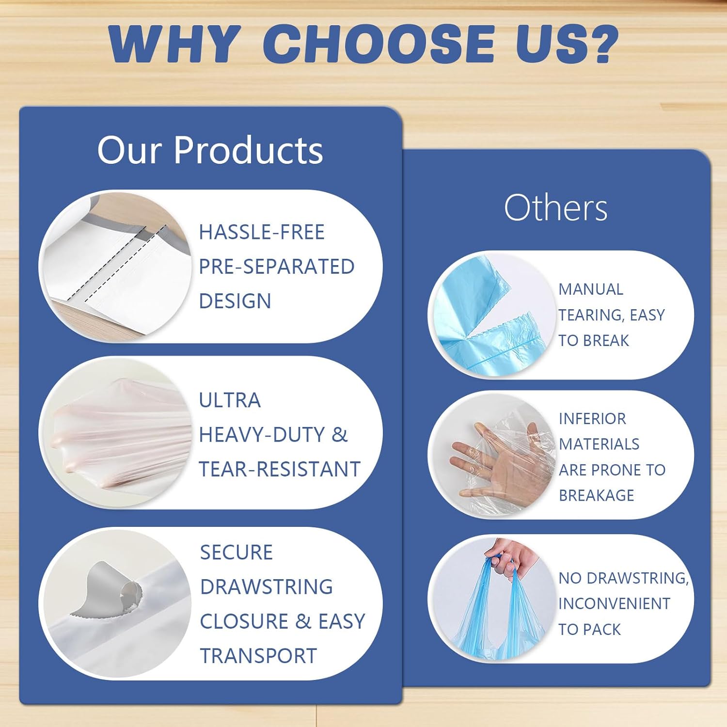 • Pre-Separated Bags: Each kitchen trash bag in the pack is individually separated, so you can quickly grab one without tearing or struggling with the roll. This thoughtful design saves you time and ensures a hassle-free experience every time
