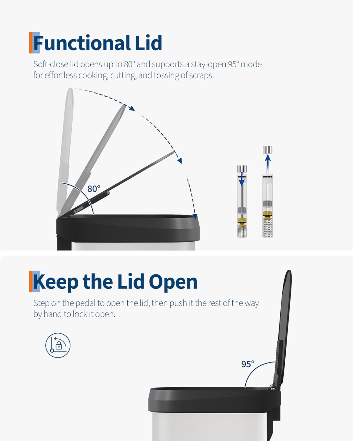 • Extended Height and Capacity: This trash can extends to 35.63 inches at full lid opening, perfectly fitting under a standard 36-inch island countertop. Its bucketless interior can hold up to 55 large water bottles or 110 cans, maximizing storage without taking up extra floor space.