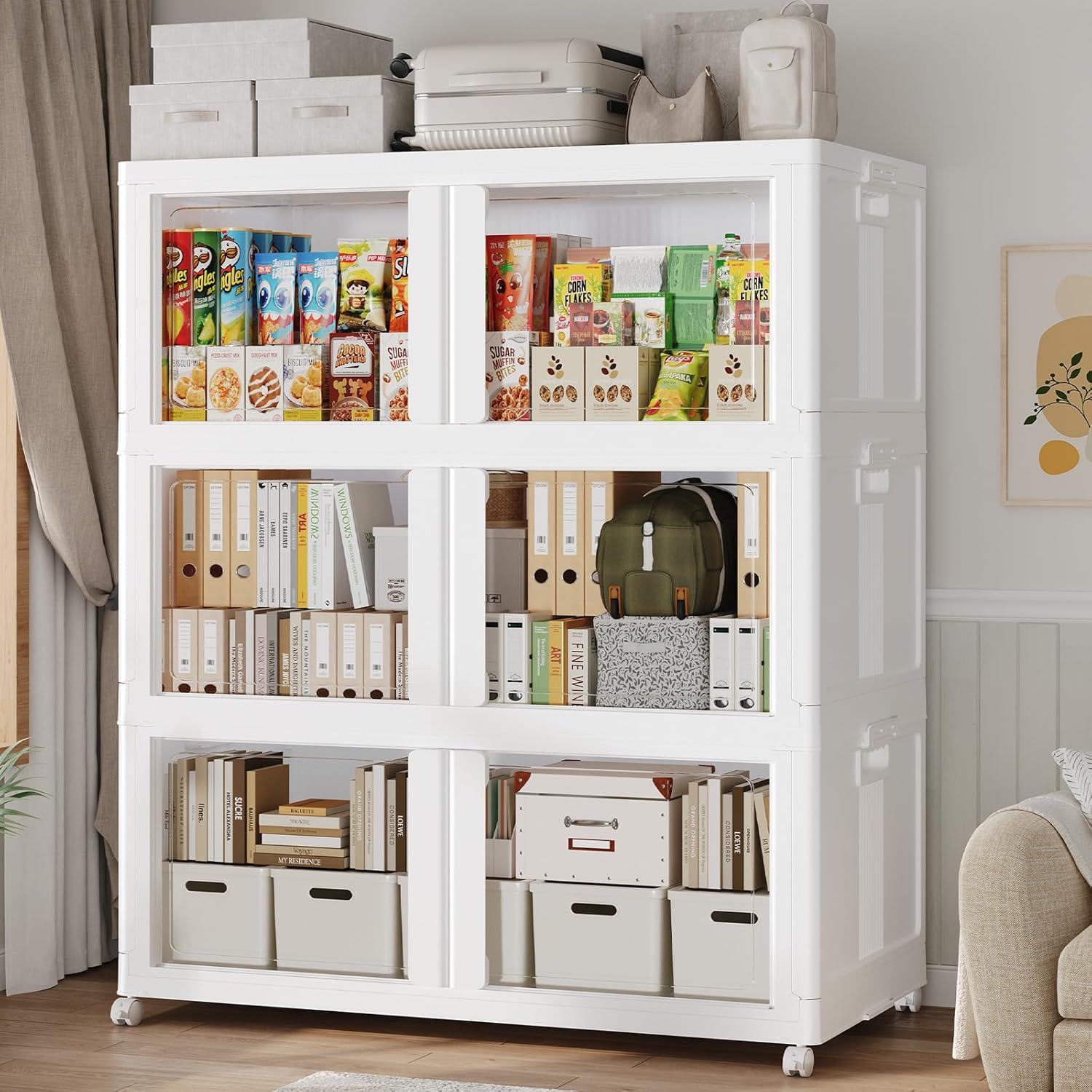 - 【Versatile Storage, Simplify Organizing】Whether as storage boxes or cabinets, the stackable foldable design makes assembly simple, while magnetic front opening enhance accessibility. You can use in living room, kitchen, bedroom, dorm room, garage, corridor, storing clothes, linens, shoes, books, crafts, food, snacks, etc. The movable totes also perfect for moving, traveling, or even RVing.