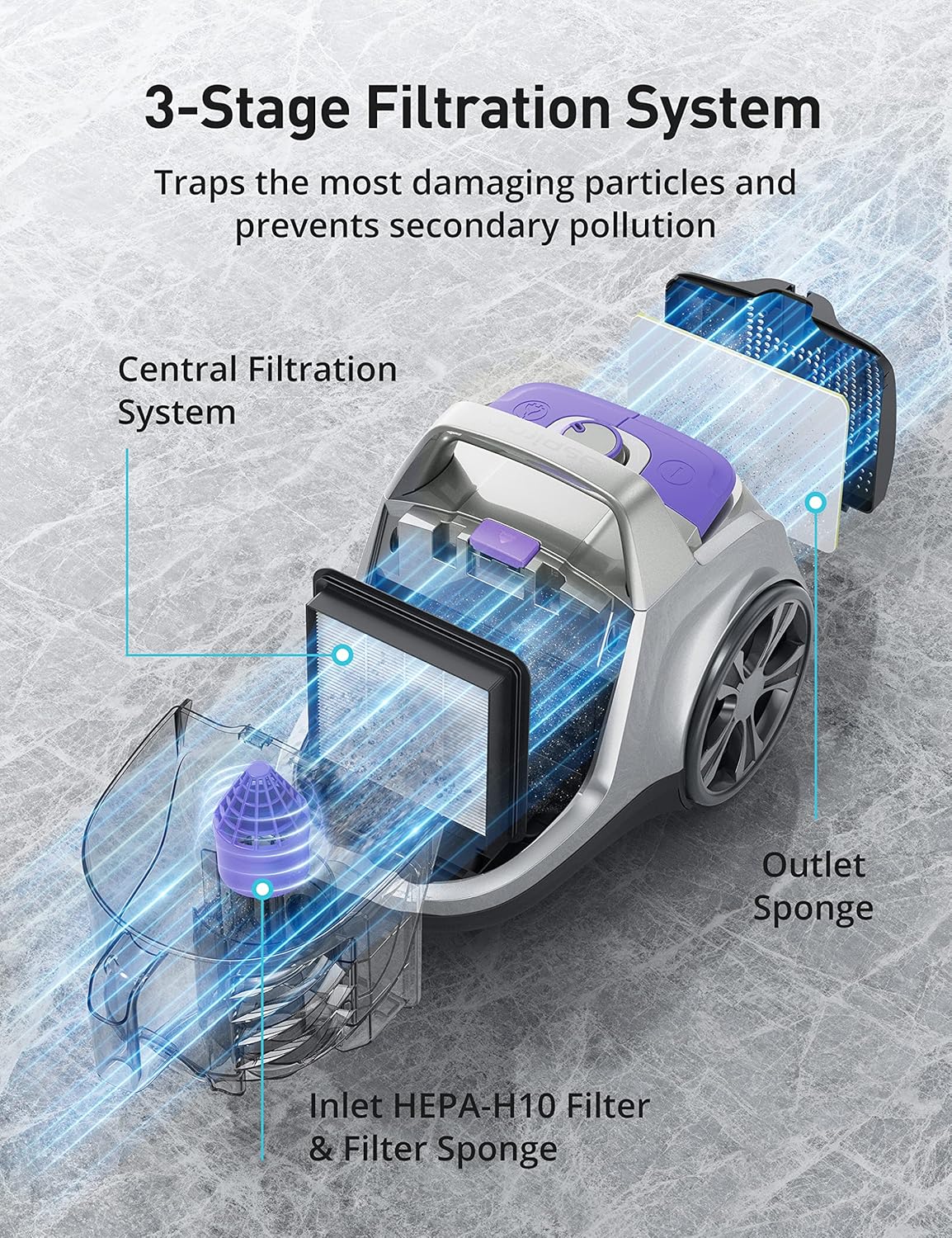 • No Air Pollution: Cyclone technology separates dust from the air; a fully sealed system with HEPA-H10 inlet filter traps fine dust, and particles and expels clean air through the outlet sponge - No worries of secondary pollution or allergy