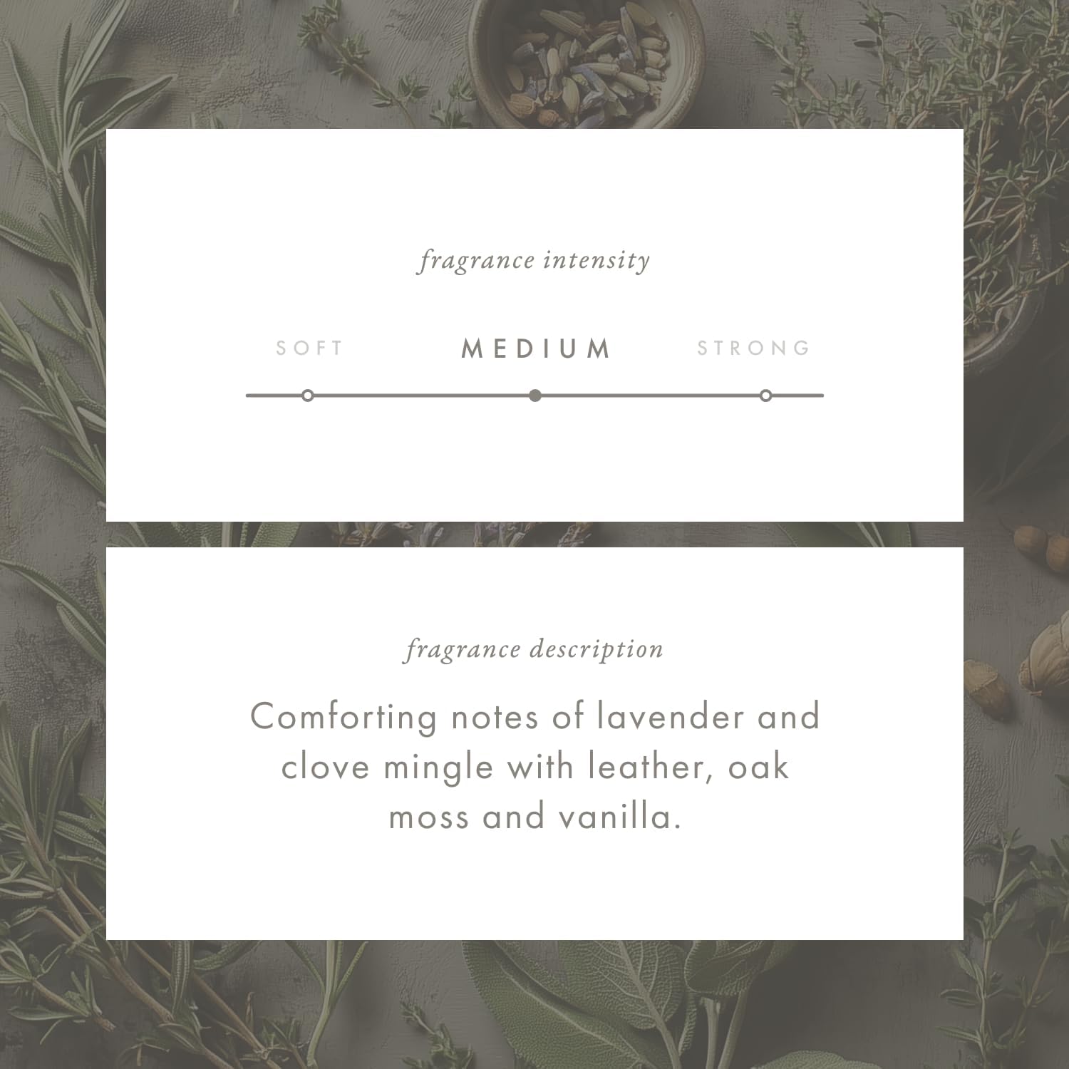 • Warm & Inviting Woody Leathery Scent – A medium-strength fragrance where lavender and clove blend with leather, oak moss, and vanilla, lifted by sage, rosemary, lime, and bergamot top notes, a heart of lavender, ginger, and clove, and a grounding base of oakmoss, timber wood, musk, and vanilla. From the Woody–Leathery family, it smells like relaxing in an aged leather chair beside a bundle of fresh blooms.