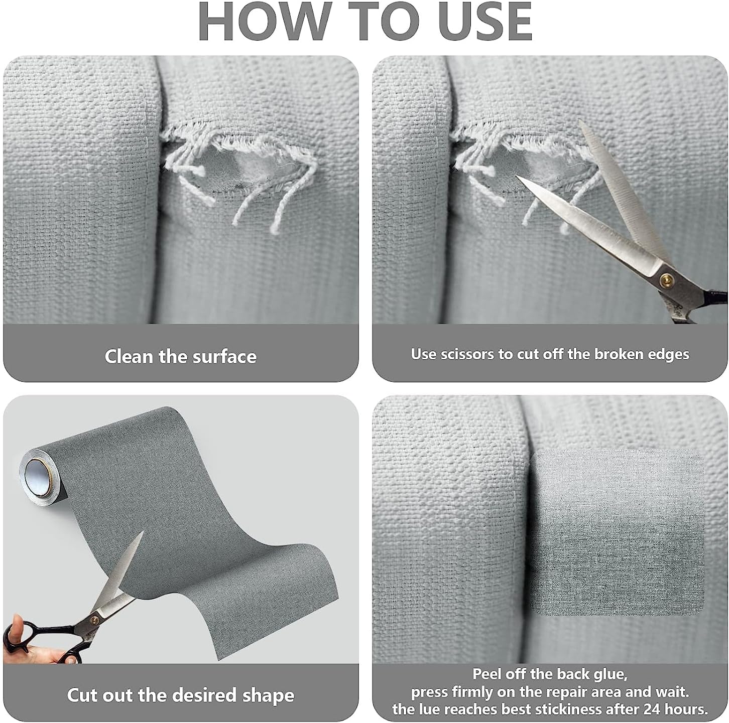 • EASY TO USE: Just peel the fabric adhesive patch backing paper then stick repair patch on holes, rips and stains in linen or canvas fabric couch, car seats or other fabric product. It only takes a few seconds to complete the maintenance work.