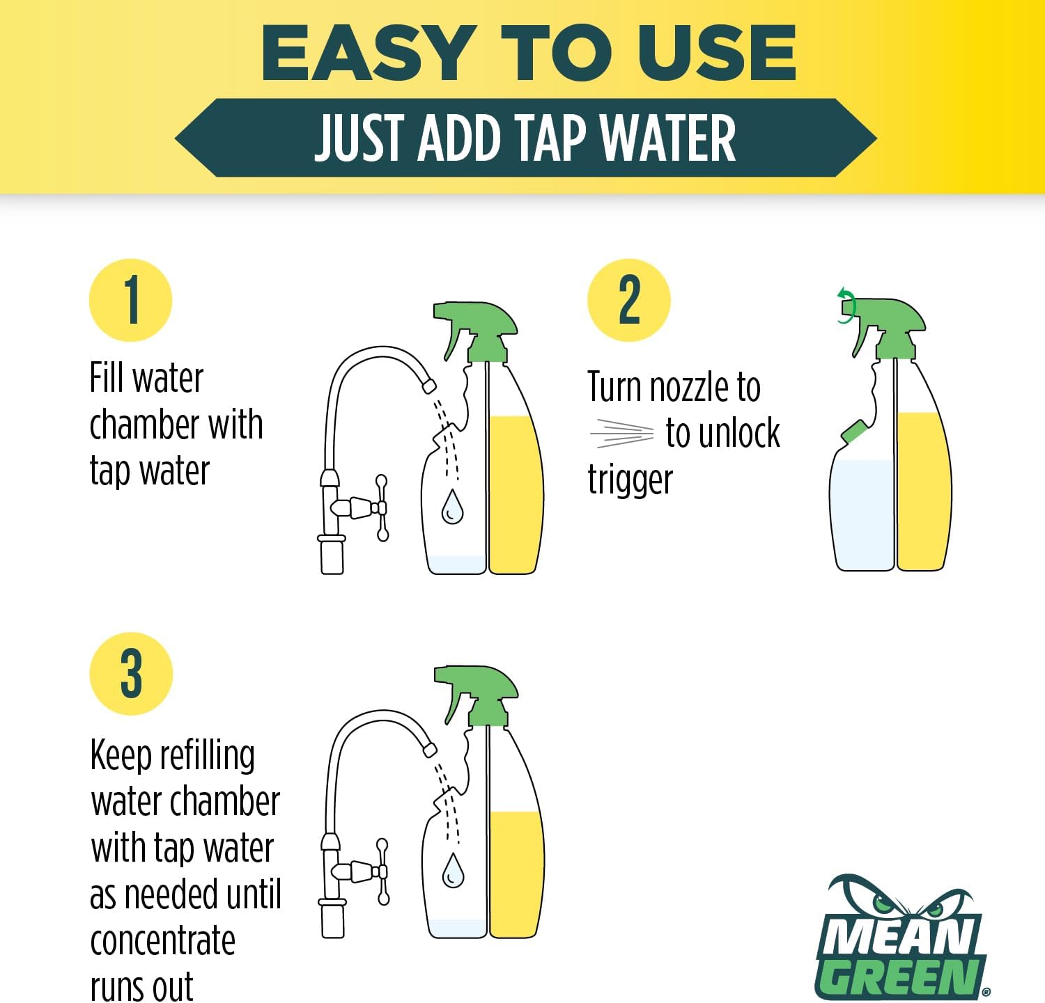 • HELP REDUCE WASTE: No additional purchases required, just refill with tap water. One Mean Green Ultra Powered Concentrate replaces four 28oz bottles of cleaner
