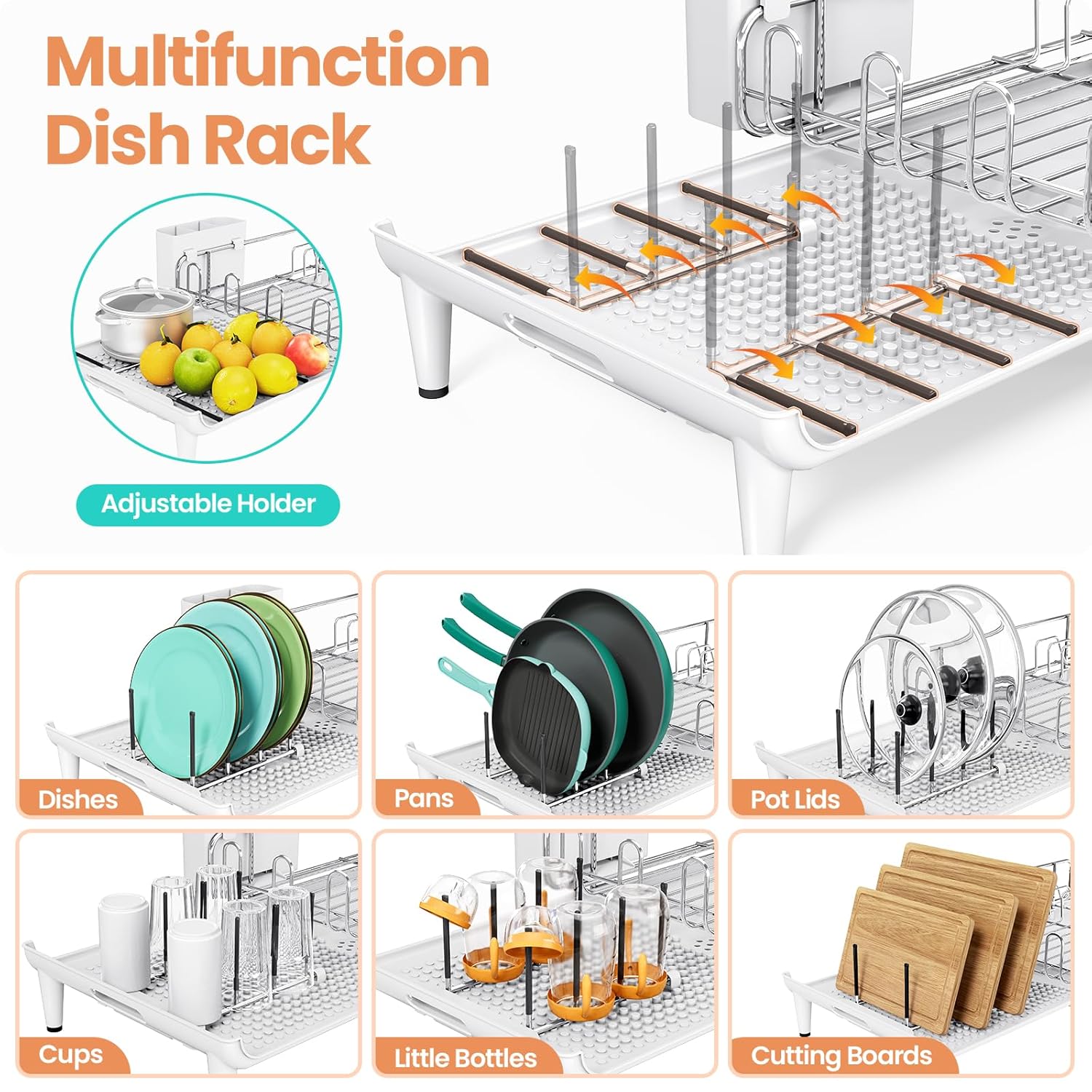 Expandable Dish Drying Rack, Foldable Dish Rack for Kitchen Counter, Stainless Steel Collapsible Dish Drainer Racks with Cutlery Holder, White
