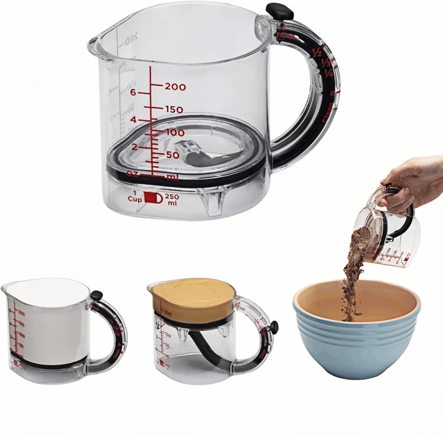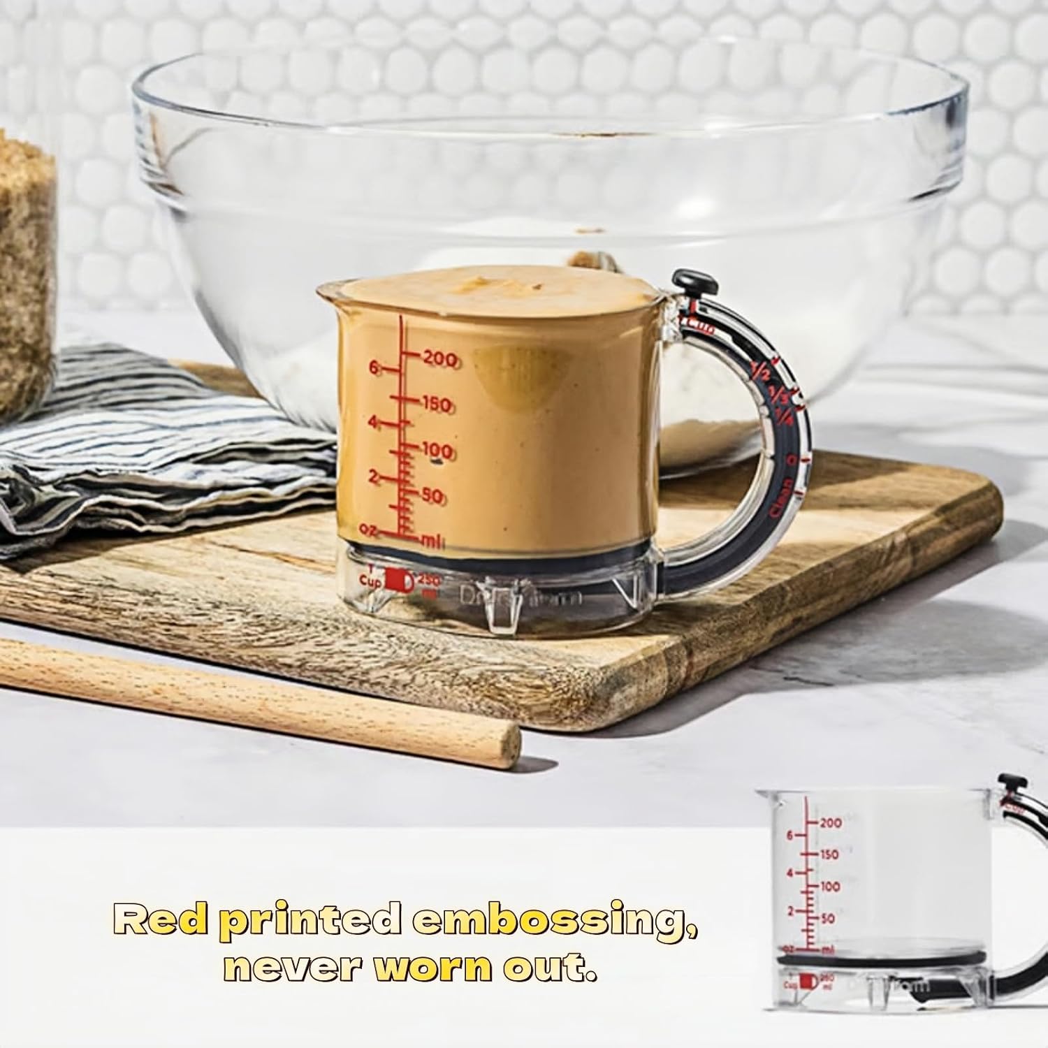 - 【4 in 1 Measuring Cup】This adjustable measuring cup is easy to use and versatile. One tool can accurately measure 1 cup, 1/2 cup, 1/3 cup, and 1/4 cup, eliminating the need to rummage through boxes and cabinets to find a pile of measuring cups