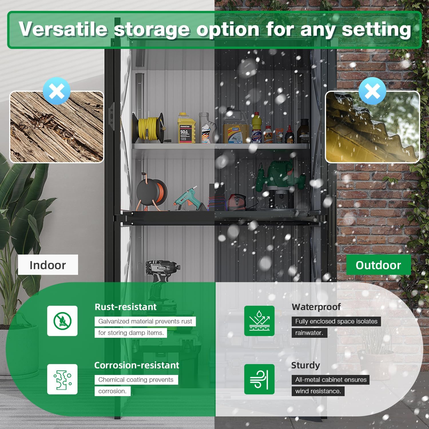 • Weatherproof Outdoor Cabinet: Fully sealed for outdoor storage waterproof protection and made from high-quality metal, weighing 95 lbs and capable of withstanding strong winds. It combines the benefits of traditional wooden and resin sheds, making it suitable for both indoor and outdoor use.