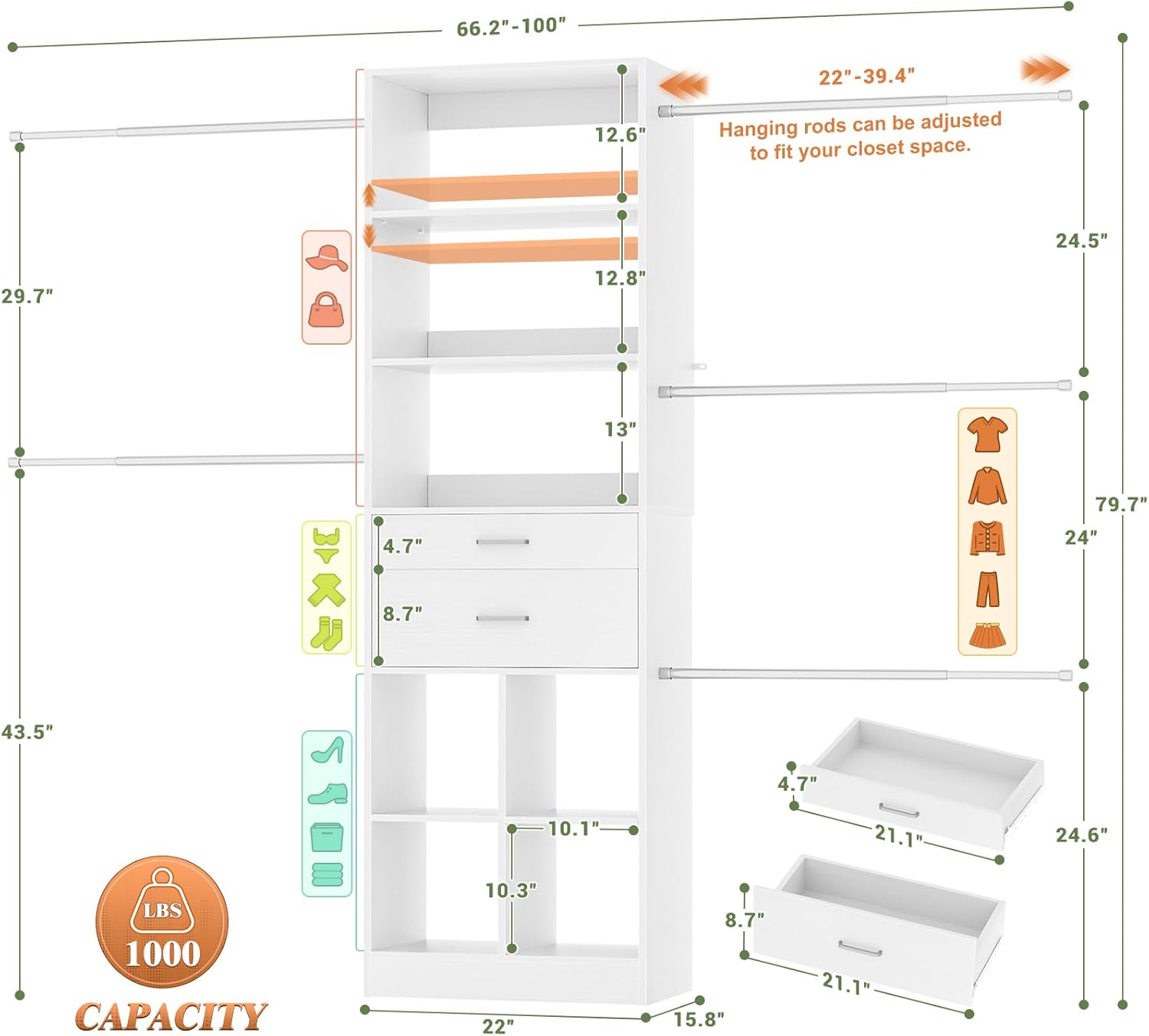 Closet System, 4-8 FT Closet Organizer Tower with 2 Wooden Drawers and Shelves, Can Fit 60 to 96 inch Walk-in Closet System with 5 Hanging Rods, Built-in, White
