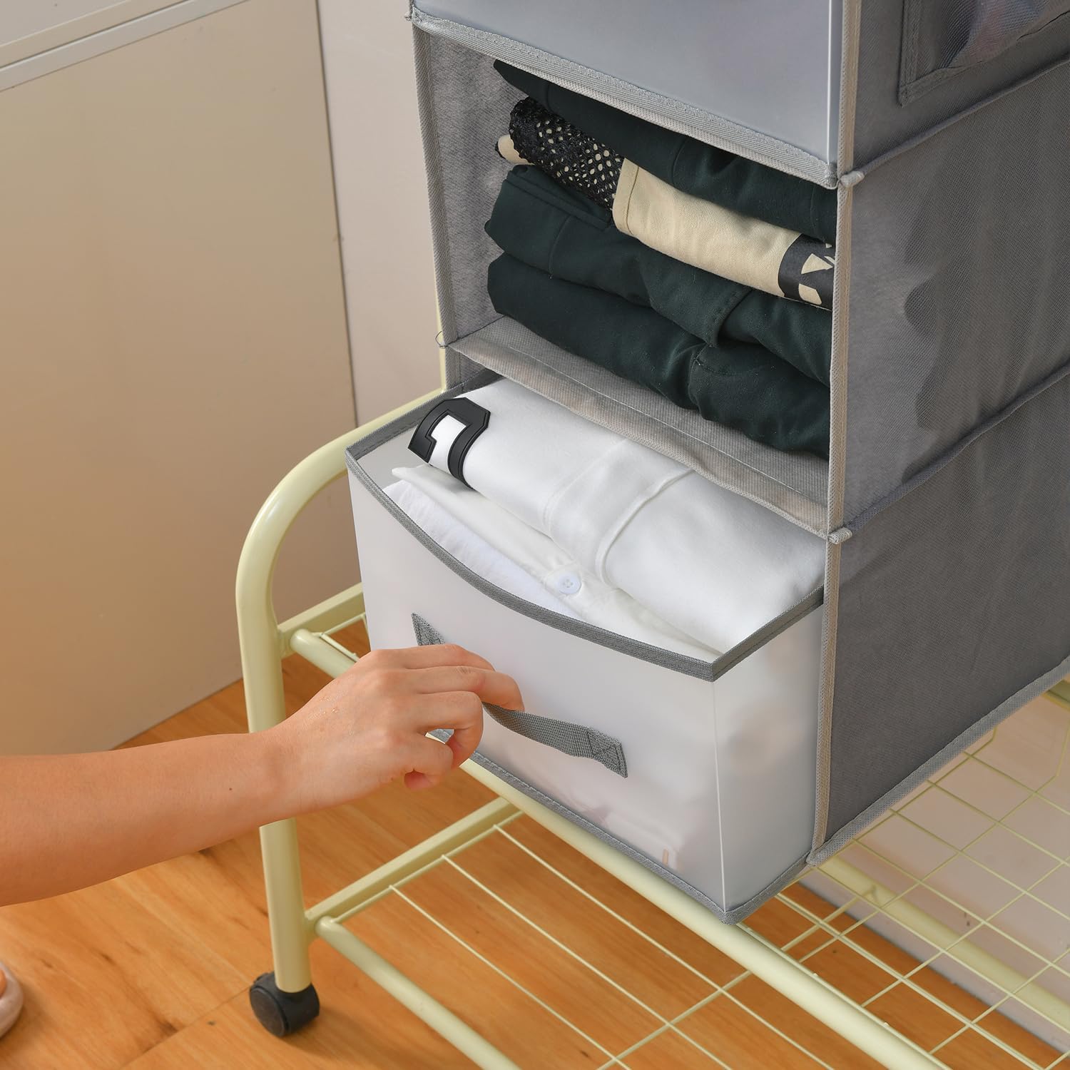 5-Tier Hanging Organizer for Closet, Fabric Closet Organizer with 2 Hooks, 2 Pull-Out Drawers, Foldable Space-Saving Storage (Gray)