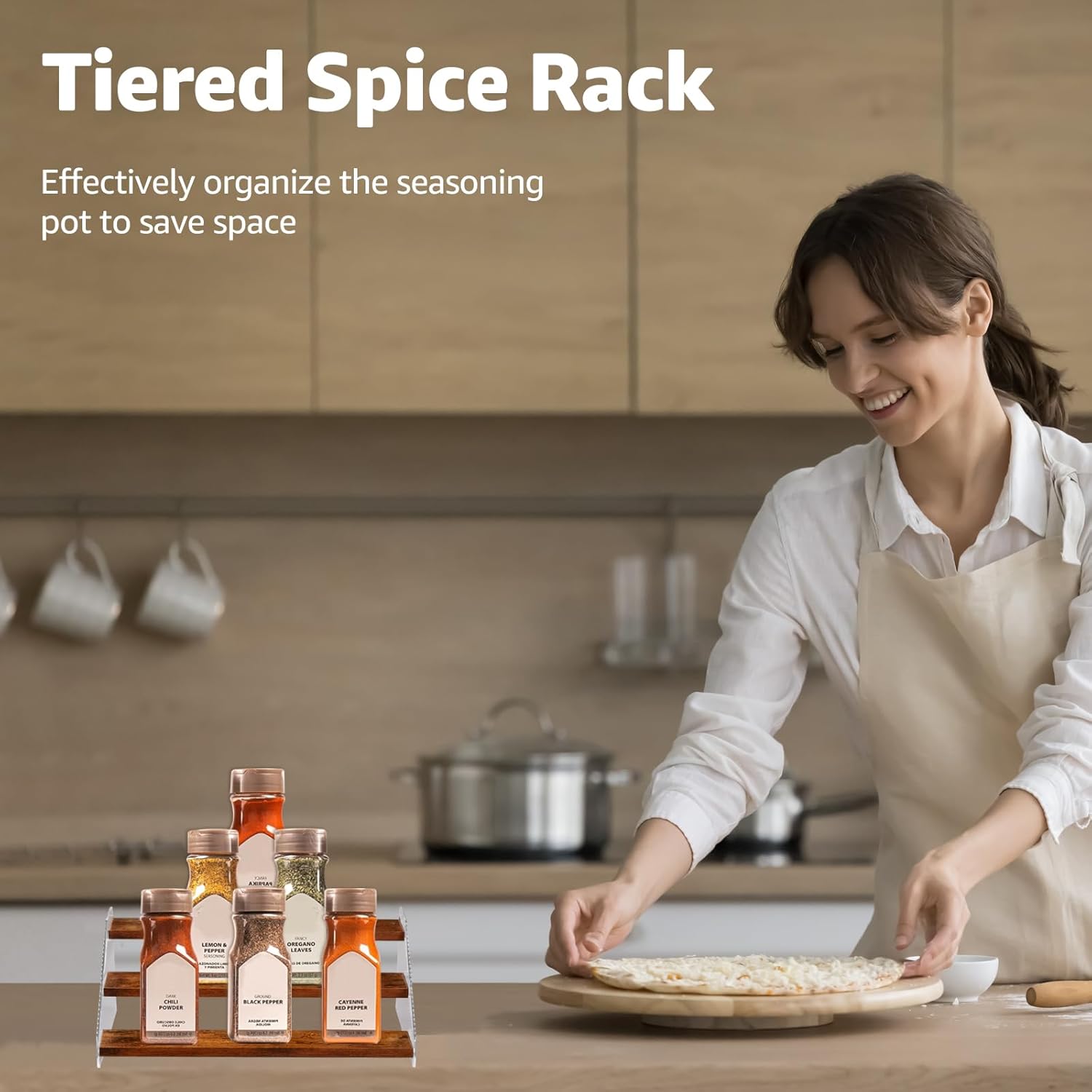 nianfeng Tiered Spice Rack, 3-Tier Spice Pantry Kitchen Cabinet Organizer, 12-Inch, Natural Wood Acrylic Stair Riser Stand, Countertop Seasoning Shelf (Rustic Brown)