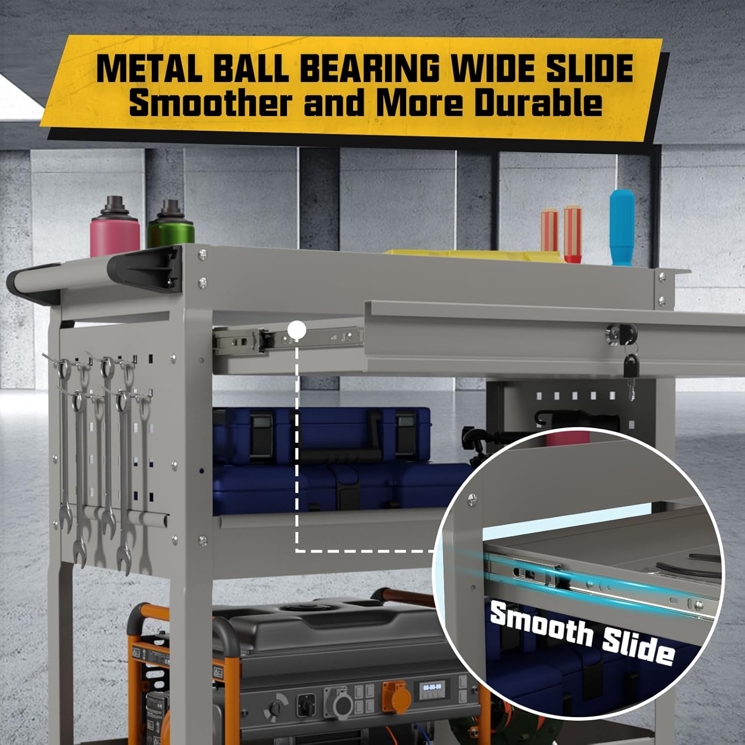• 【Spacious Storage】This tool cart features 3 tiers of storage space, lockable sliding drawers, and extra tool slots on both sides to organize various tools neatly. Thanks to its high-strength body, it supports a maximum load of 450 pounds, easily handling heavy tools or boxes.capacity of 450 pounds.