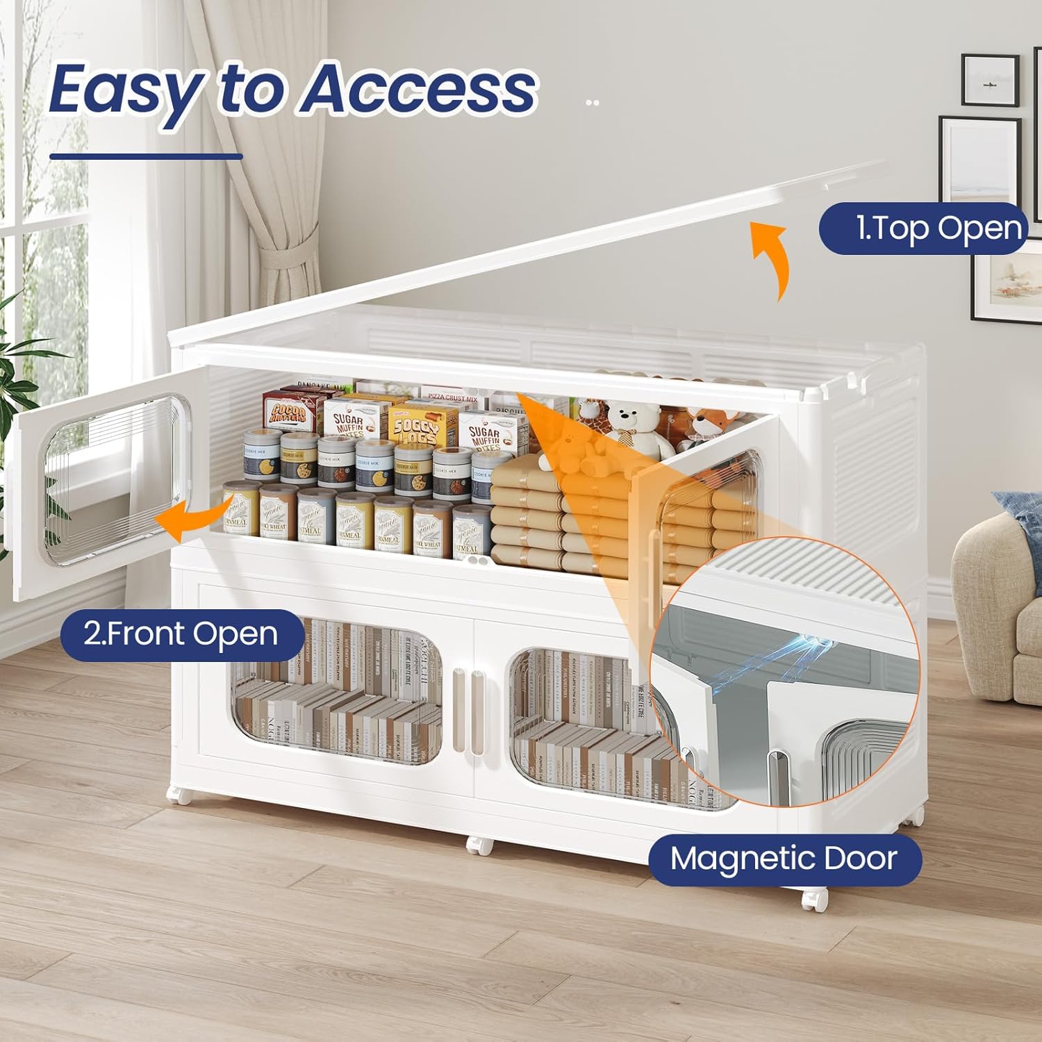 - 【Two Ways to Open & Magnetic Easy Access】The collapsible storage bins with doors and wheels feature a dual access way, allowing for both top and front door openings, and with clear brown windows for easy visibility. The extra large storage bins with open front doors are equipped with magnetic lock buckles to prevent dust from entering the cabinet.