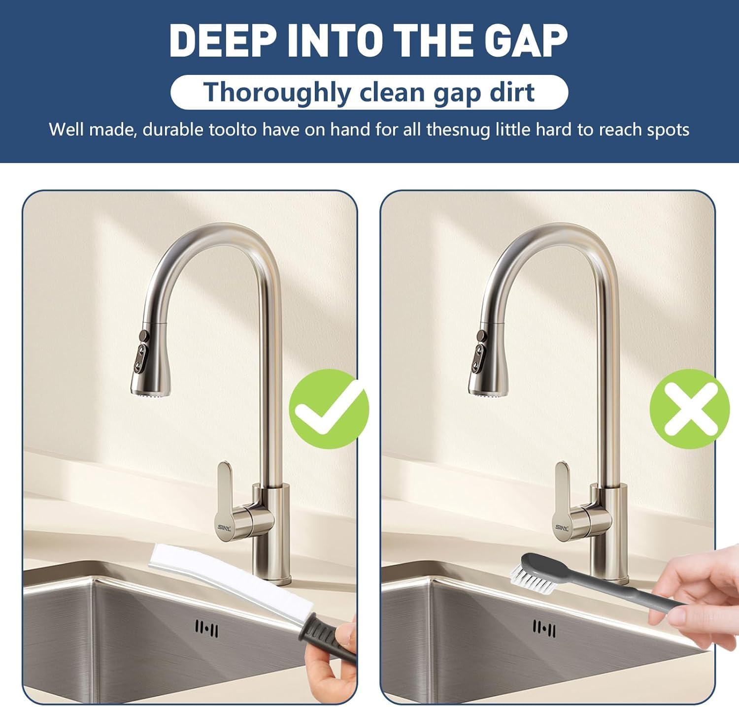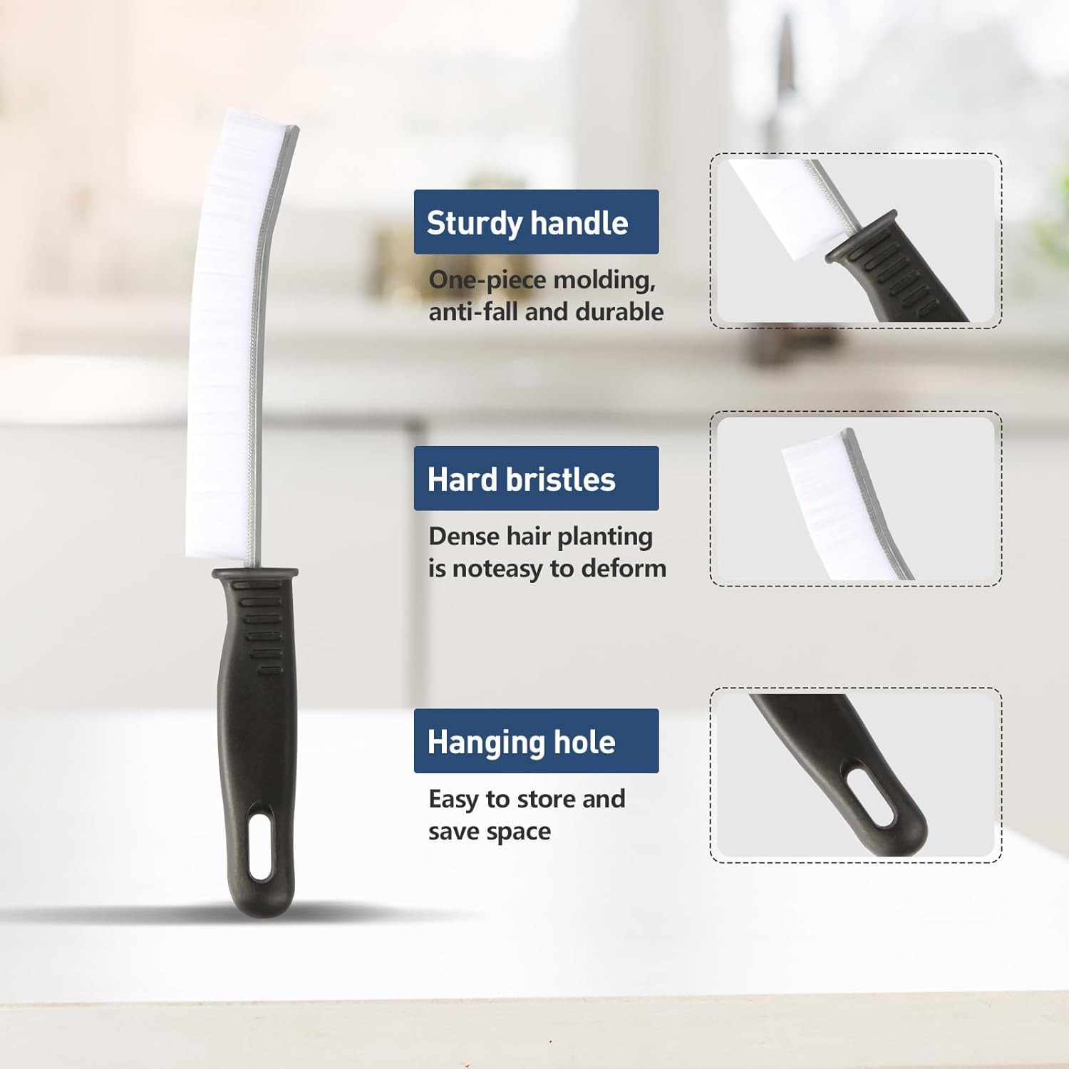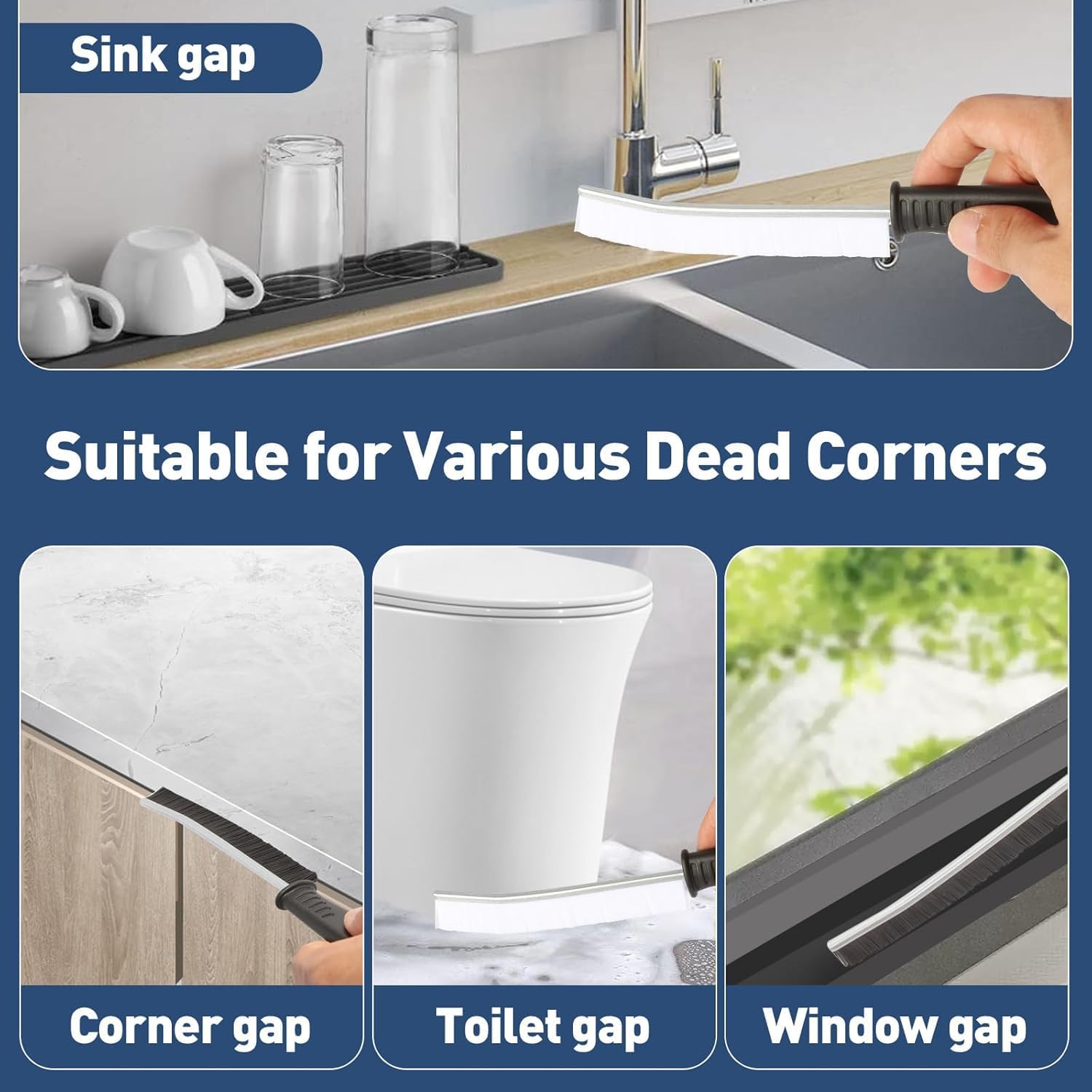 • The brush top is designed as a small arc for easy penetration into crevices, allowing you to tackle gaps around window tracks, sliding door tracks, shower door tracks, toilet lid gaps, and gaps around kitchen sinks and bathroom basins.